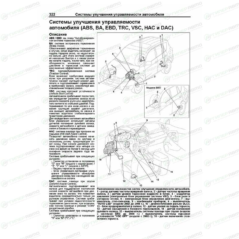 - Приведены инструкции по диагностике 18 электронных систем: управления двигателем, АКПП, CVT, 4WD, контроля давления в шинах, блокировки рулевого управления, EPS, ABS, VSC, кондиционирования, SRS, Entry&Start, комбинации приборов, автоматического включения фар и габаритов, электропривод стеклоподъемников, электропривод люка, иммобилайзер, системы поддержания скорости.