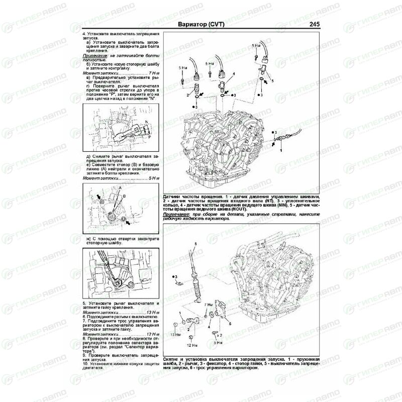 Издание содержит руководство по эксплуатации, описание некоторых систем, подробные сведения по техническому обслуживанию автомобилей, диагностике, ремонту и регулировке элементов систем двигателя (в т.ч. систем управления двигателем, изменения фаз газораспределения (VVT), бесступенчатого изменения высоты подъема клапанов (VALVEMATIC), зажигания, запуска и зарядки), элементов механических (пяти- и шестиступенчатых МКПП) и автоматических (четырех- и пятиступенчатых АКПП) коробок передач, вариатора (CVT), раздаточной коробки (включая систему управления полным приводом (4WD)), заднего редуктора, элементов тормозной системы (включая гидравлический усилитель тормозов, антиблокировочную систему тормозов (ABS), систему экстренного торможения (ВА), противобуксовочную систему (TRC), систему курсовой устойчивости (VSC), систему помощи при спуске (DAC), систему помощи при трогании на подъеме (НАС)), рулевого управления (включая электроусилитель рулевого управления (EPS)), подвески (включая систему контроля давления в шинах), кузовных элементов, систем кондиционирования (АС) и вентиляции, системы пассивной безопасности (SRS).