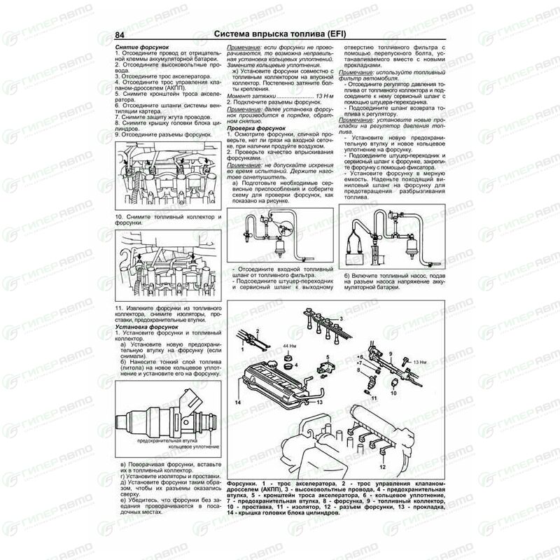 Издание содержит подробные сведения по ремонту и регулировке механизмов двигателя, элементов системы впрыска топлива, системы изменения фаз газораспределения (VVT-i), зажигания, систем запуска и зарядки, инструкции по использованию системы самодиагностики, а также возможные неисправности и методы их устранения, сопрягаемые размеры основных деталей и пределы их допустимого износа.