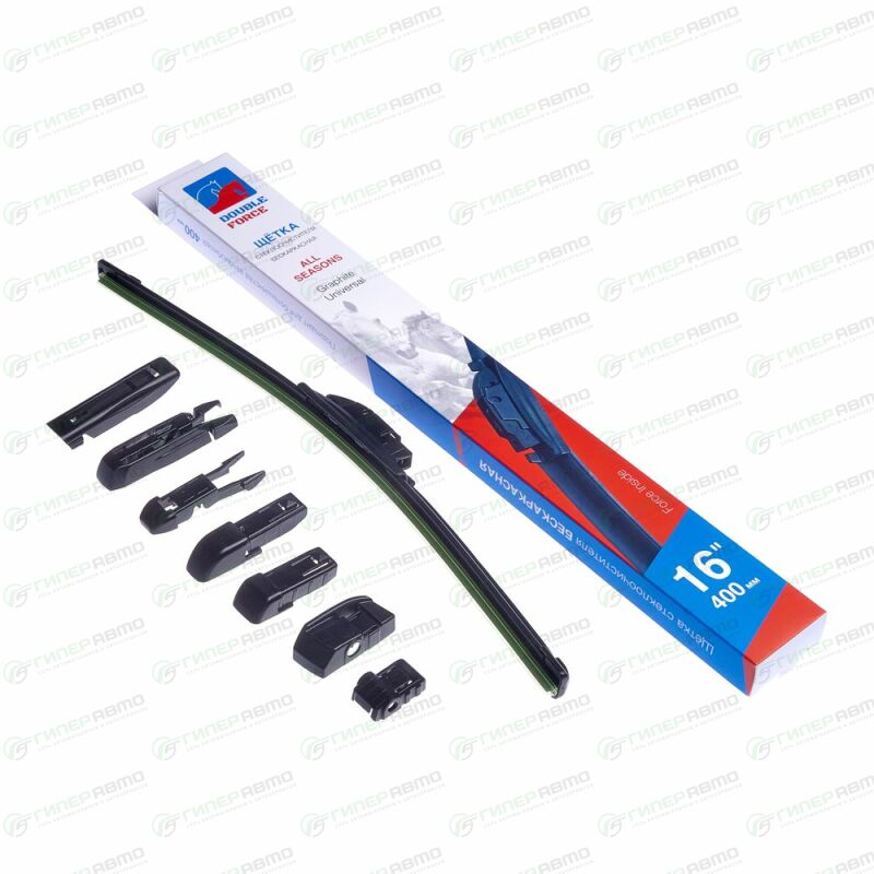 Вы можете купить щетка стеклоочистителя double force 400мм (16") бескаркасная, всесезонная, 7 переходников, 1 шт, арт. dff16 в интернет-магазине автомобильных дворников Гиперавто. Цена на Double Force DFF16, описание, характеристики и фотографии.