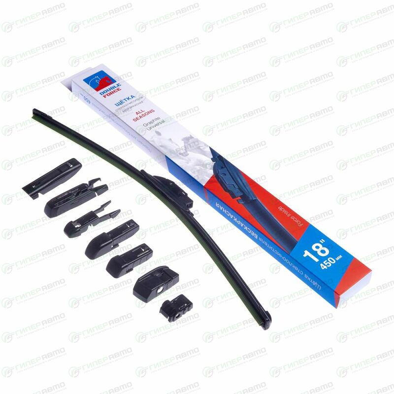 Вы можете купить щетка стеклоочистителя double force 450мм (18") бескаркасная, всесезонная, 7 переходников, 1 шт, арт. dff18 в интернет-магазине автомобильных дворников Гиперавто. Цена на Double Force DFF18, описание, характеристики и фотографии.