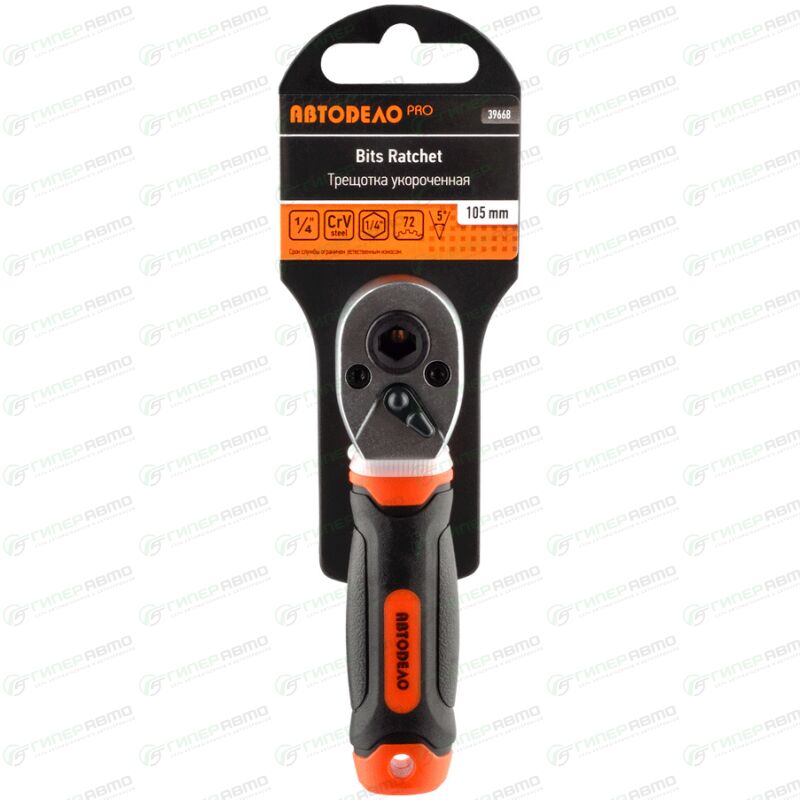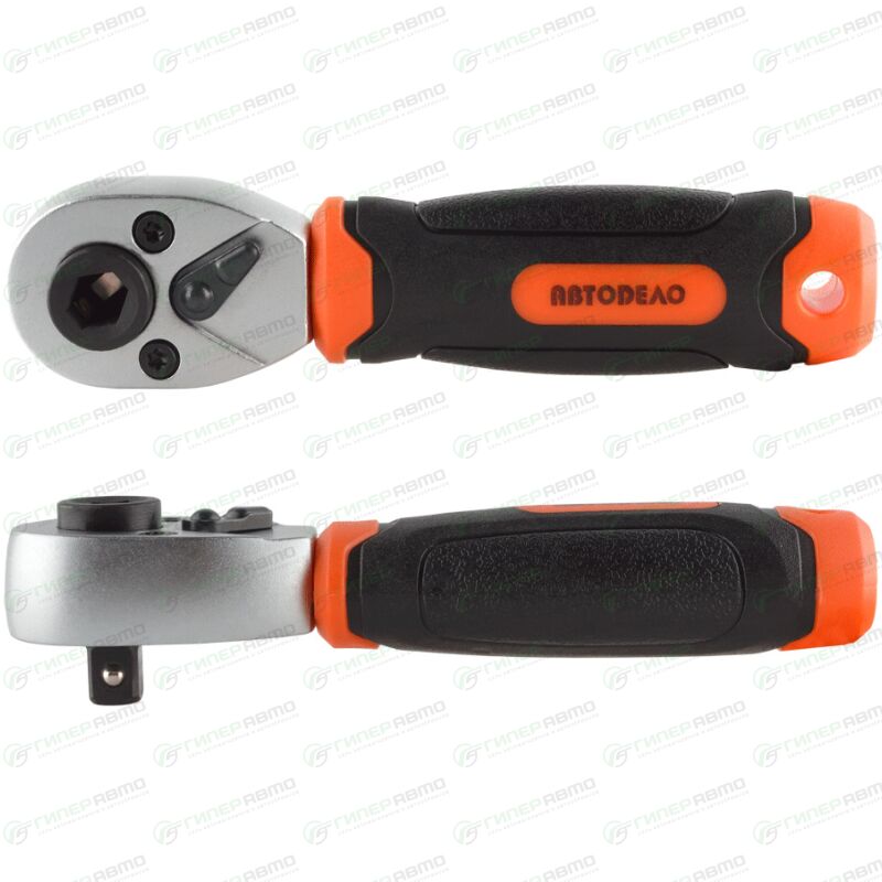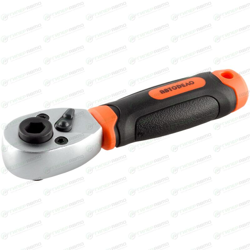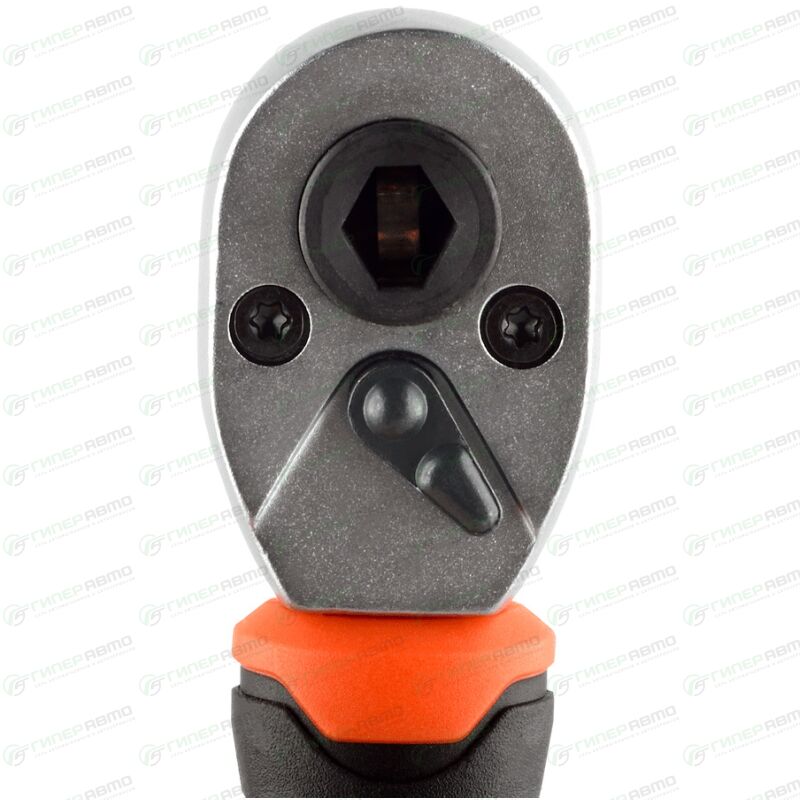 Имеет стандартный присоединительный квадрат 1/4 с фиксирующим шариком и механизмом быстрого сброса. Флажковый механизм трещотки позволяет переключать направление рабочего вращения и обеспечивает минимальный угол поворота 5 градусов за счет привода с 72-мя зубцами. Длина трещотки: 105 мм.